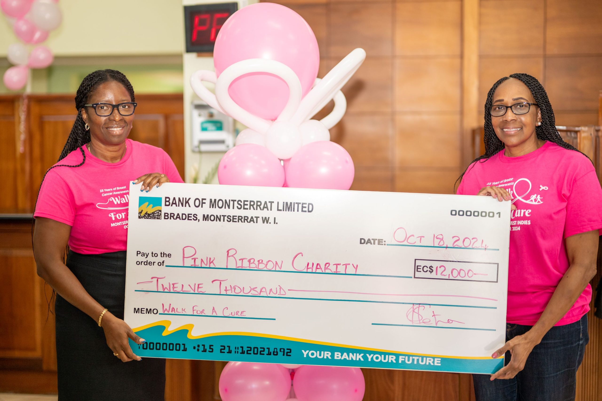 (Press Release) Pink Ribbon Charity Montserrat is proud to announce that Bank of Montserrat Limited has joined as the title sponsor for this year’s Breast Cancer Awareness Walk. The bank’s generous contribution of EC $12,000 will support the charity’s month of activities and ongoing efforts to promote breast health and provide free mammograms for women in need.