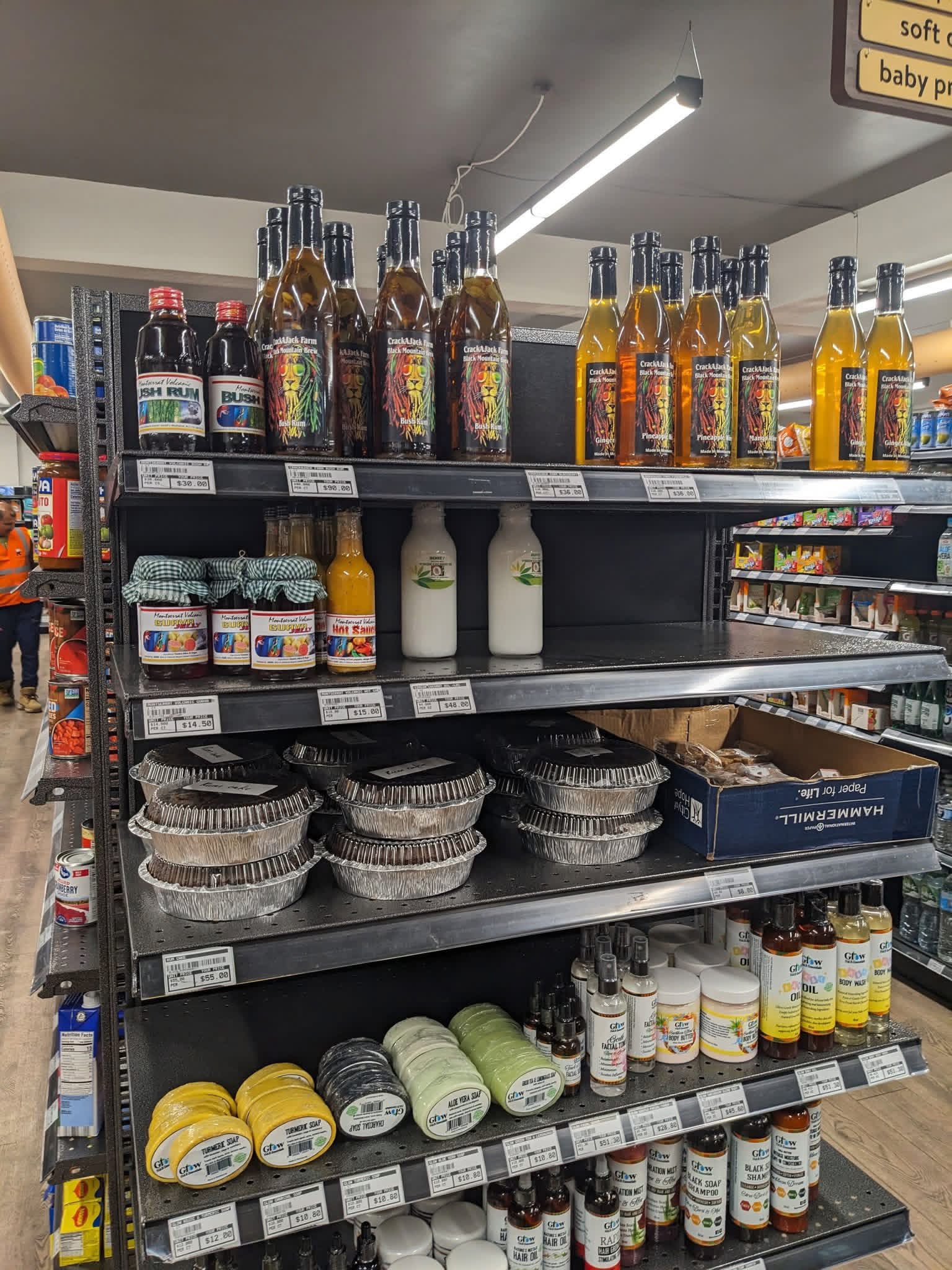 Currently on Victor’s Supermarket shelves under the Made in Montserrat banner are a growing range of locally produced goods, including Montserrat Volcano guava jelly and bush rum by Juliana Meade, hair and body products from Christal Edgecombe’s Glow H&B Essentials, Crack-a-Jack bush rum and ginger wine, as well as pastries and desserts supplied by local home bakers.