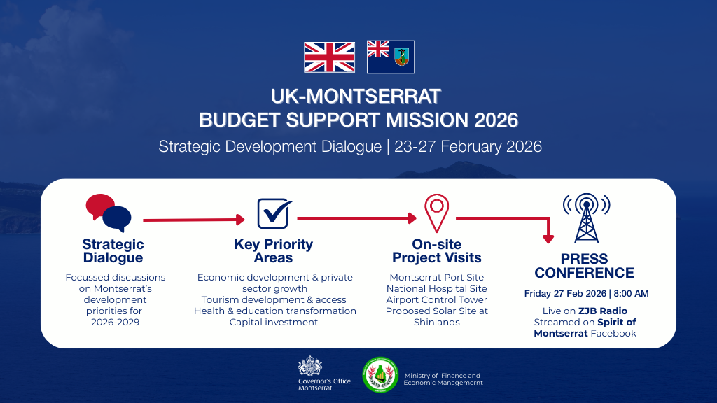 The conference will provide the public with an update on the outcomes of the week’s discussions and the direction of the partnership between the UK and Montserrat for the 2026/27 to 2028/29 financial period.
