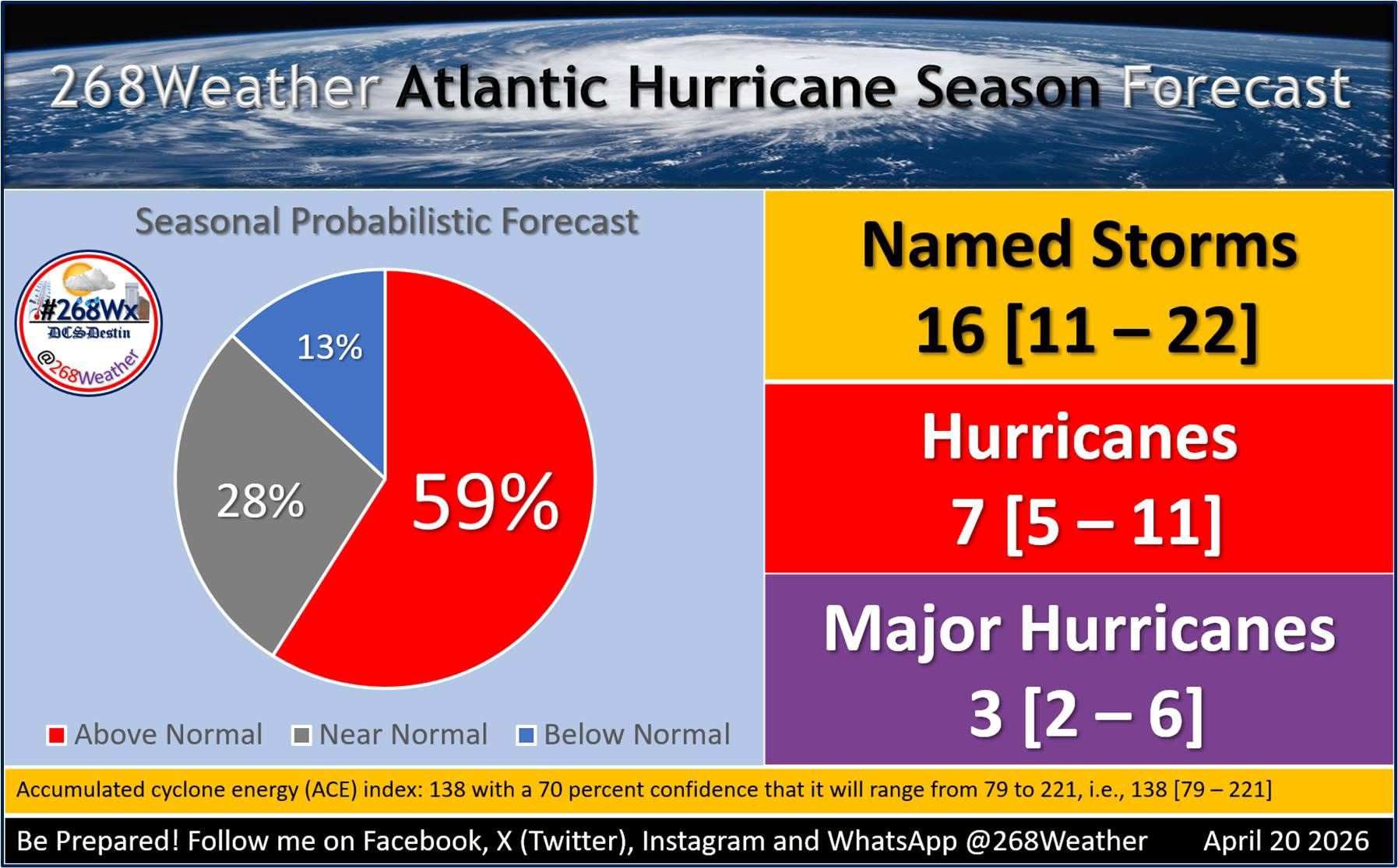 The forecast also includes an Accumulated Cyclone Energy (ACE) index of 138, above the historical average of 123. ACE is a measure used to estimate the overall activity and energy of a hurricane season.