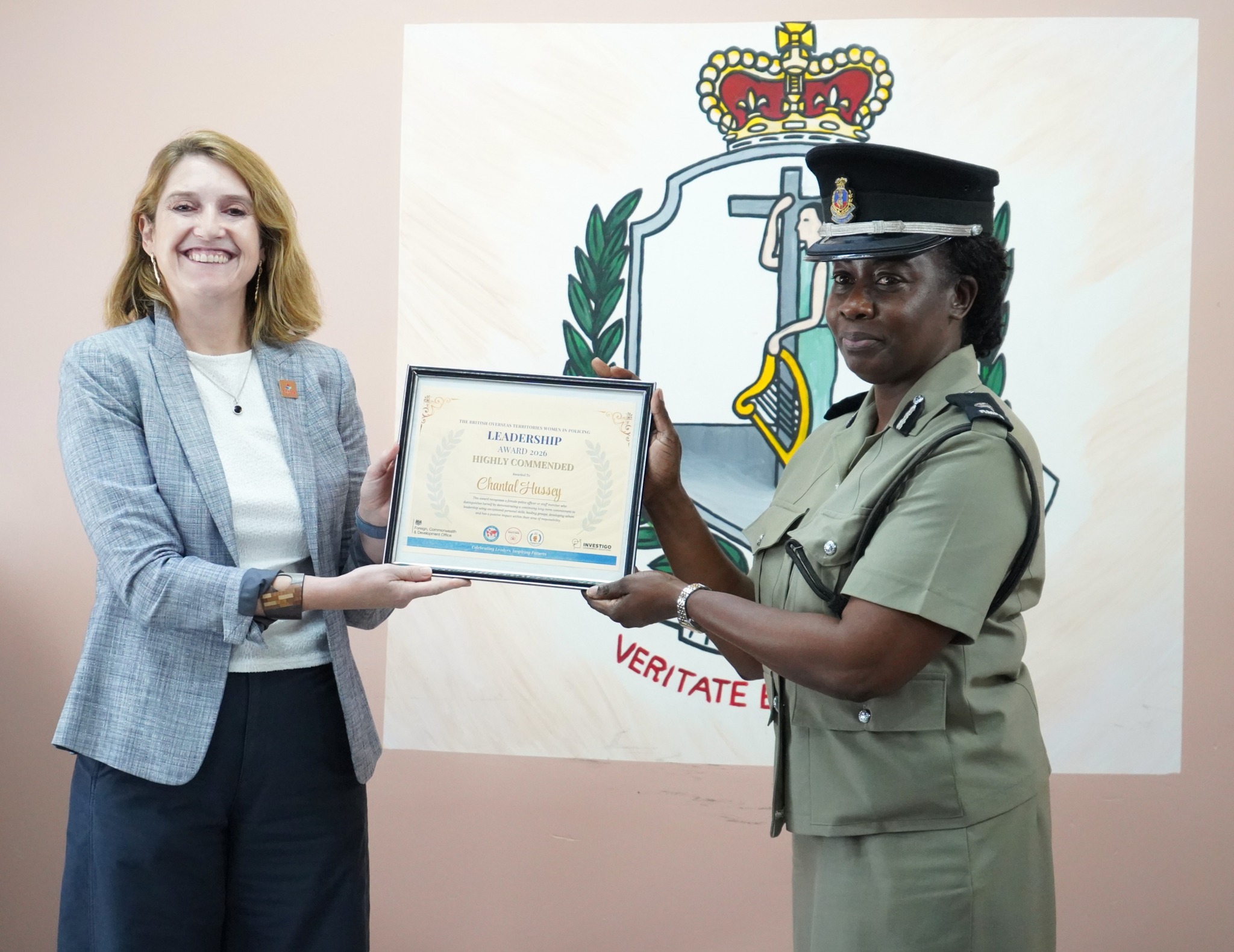 The virtual ceremony was held on 29 April 2026, with officers and colleagues gathering at RMPS Headquarters to mark the occasion. Her Excellency Governor Harriet Cross presented the Leadership Award certificate, while Acting Commissioner of Police Andrew Lewis presented the Inspirational Woman Award.